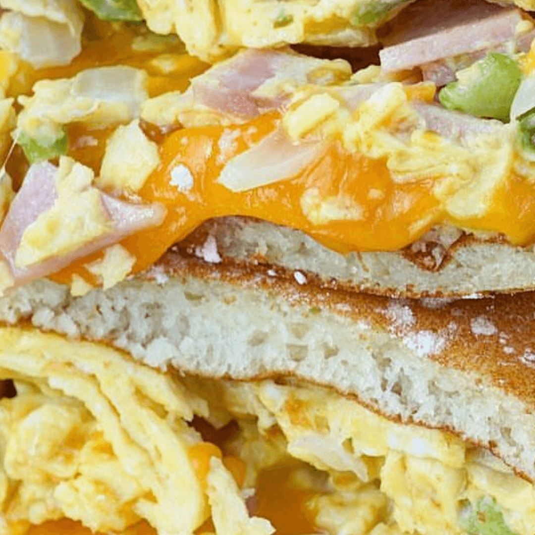 Scrambled eggs with onions, peppers, jalapeños, ham and cheddar. All fillings are rolled up in a large pancake or stuffed in a waffle and served with homefries