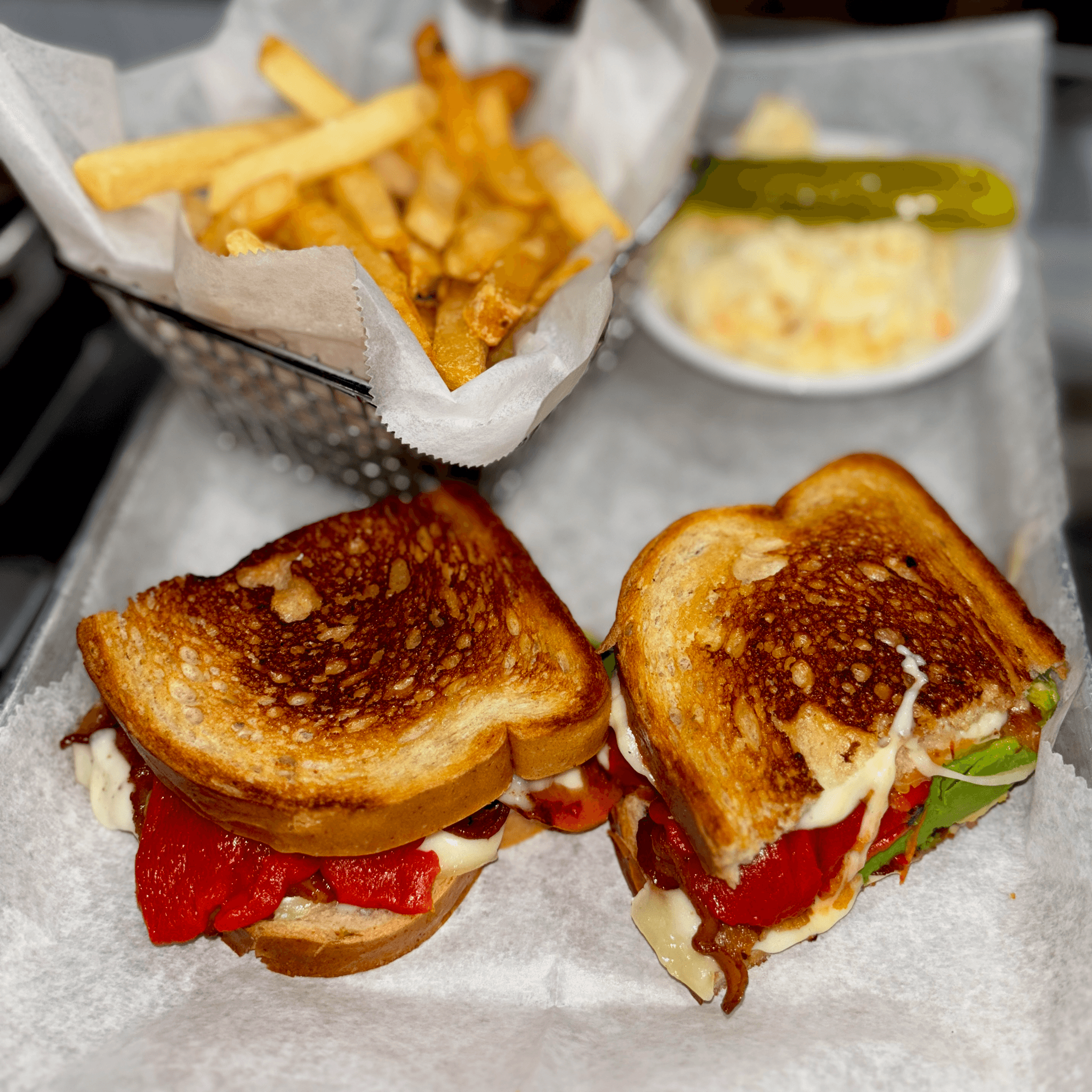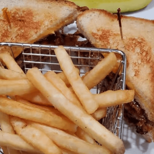 With bacon, frizzled onions and BBQ sauce nestled between two full grilled cheese sandwiches. Our 8 oz burgers are 100% sirloin, fresh never frozen and served with French fries, on a brioche bun. Coleslaw & pickle upon request (Cooked med well unless notified).