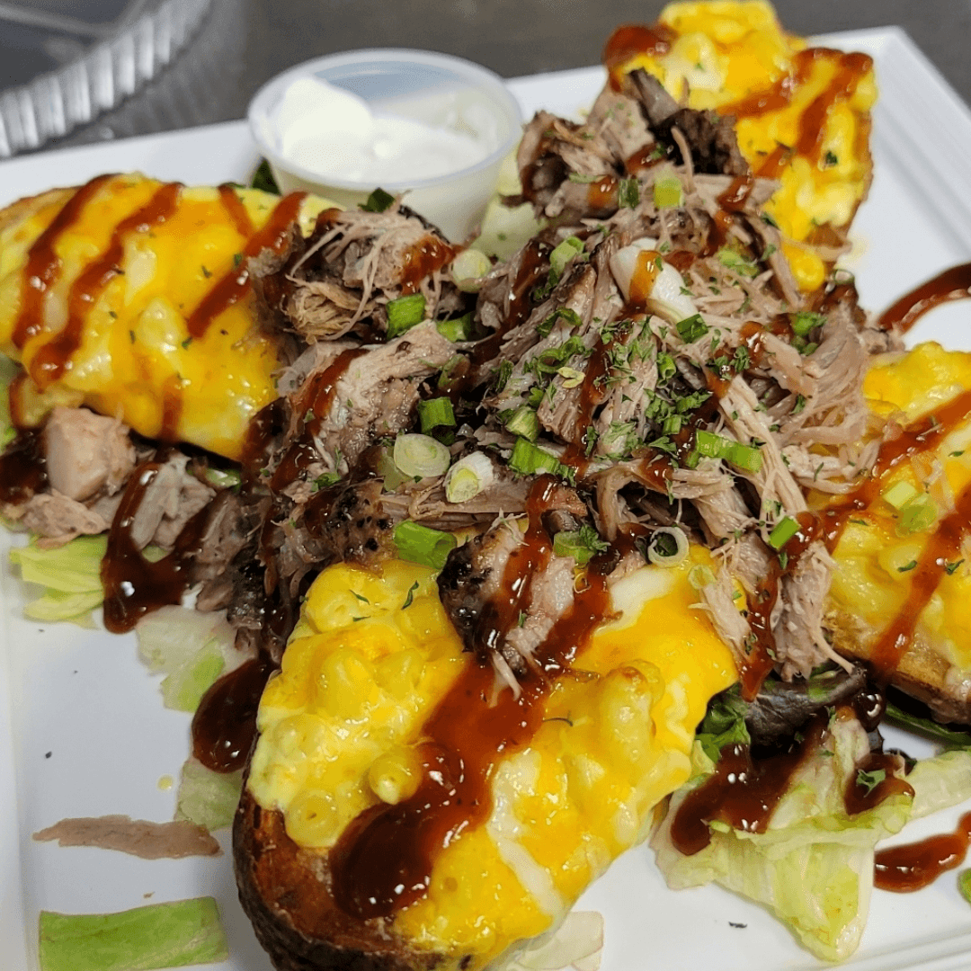 With pulled pork carnitas, smothered with mac & cheese. Our 8 oz burgers are 100% sirloin, fresh never frozen and served with French fries, on a brioche bun. Coleslaw & pickle upon request (Cooked med well unless notified).