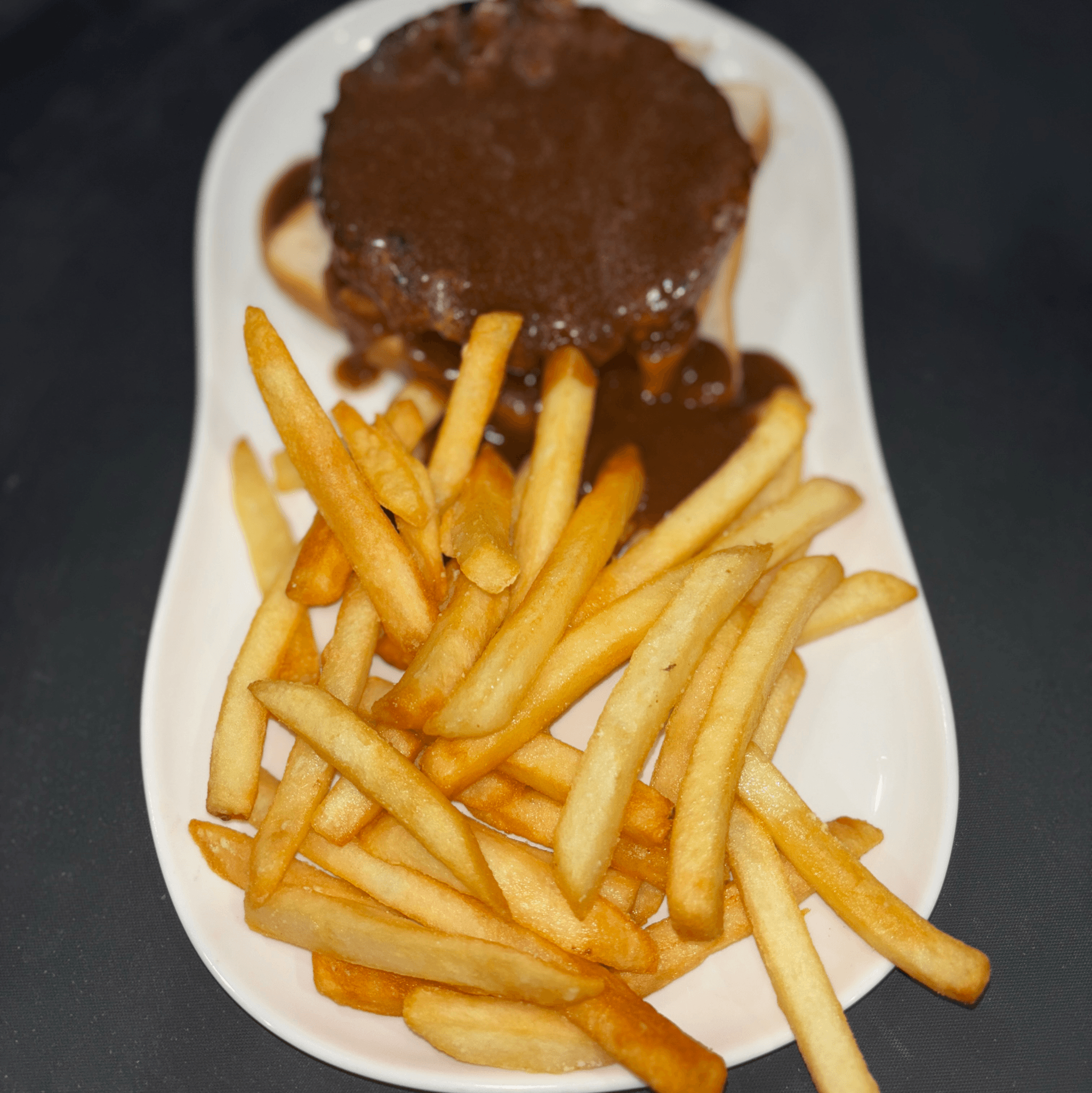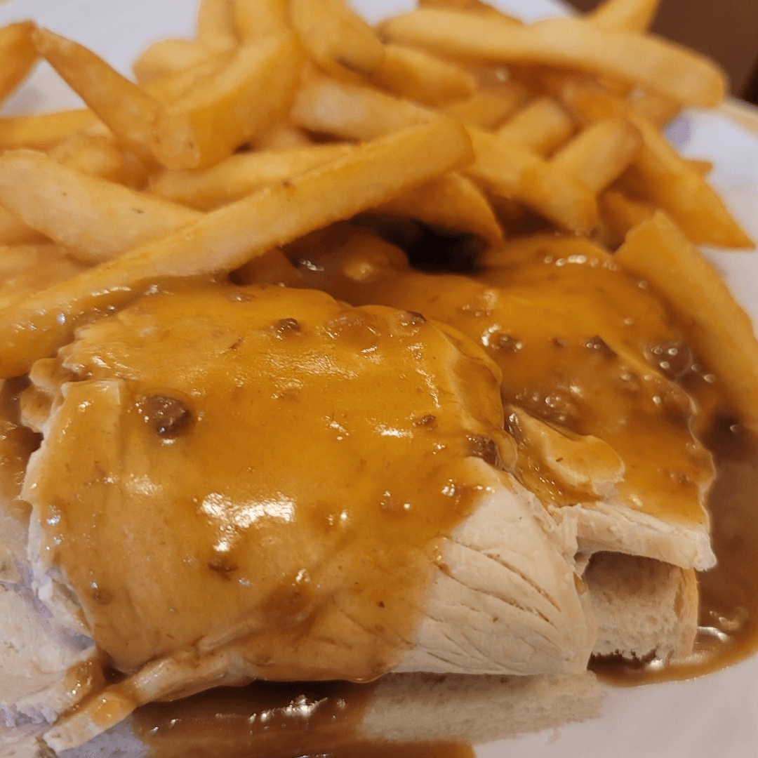 Served open faced on white bread with brown gravy. Our 8 oz burgers are 100% sirloin, fresh never frozen and served with French fries, on a brioche bun. Coleslaw & pickle upon request (Cooked med well unless notified).