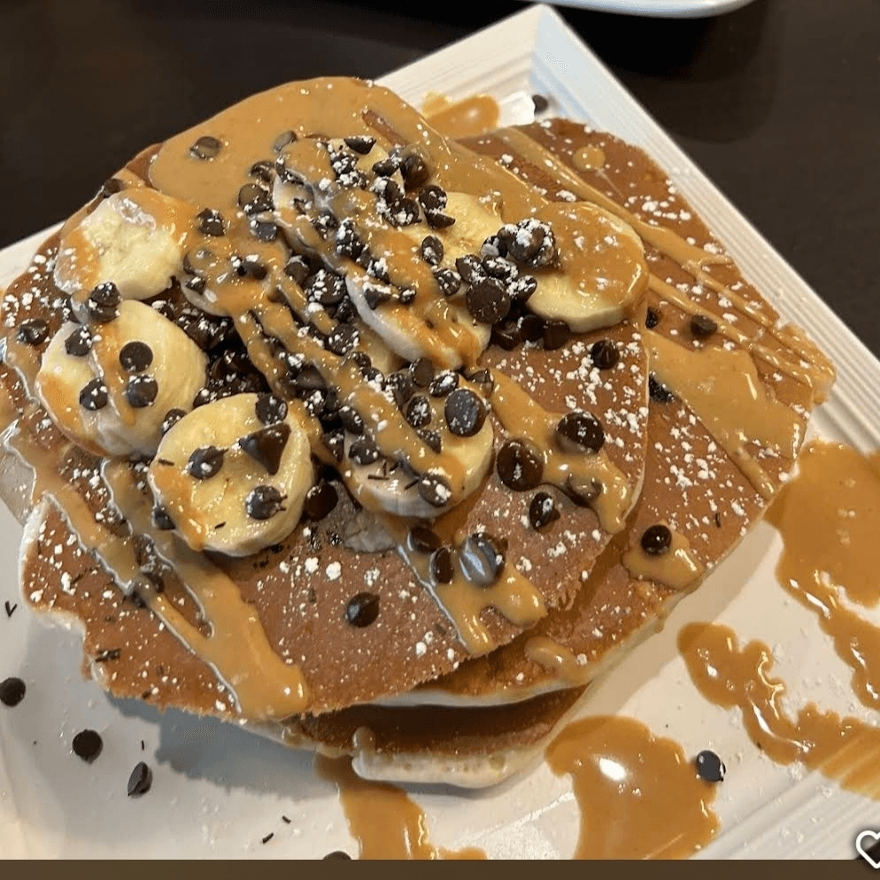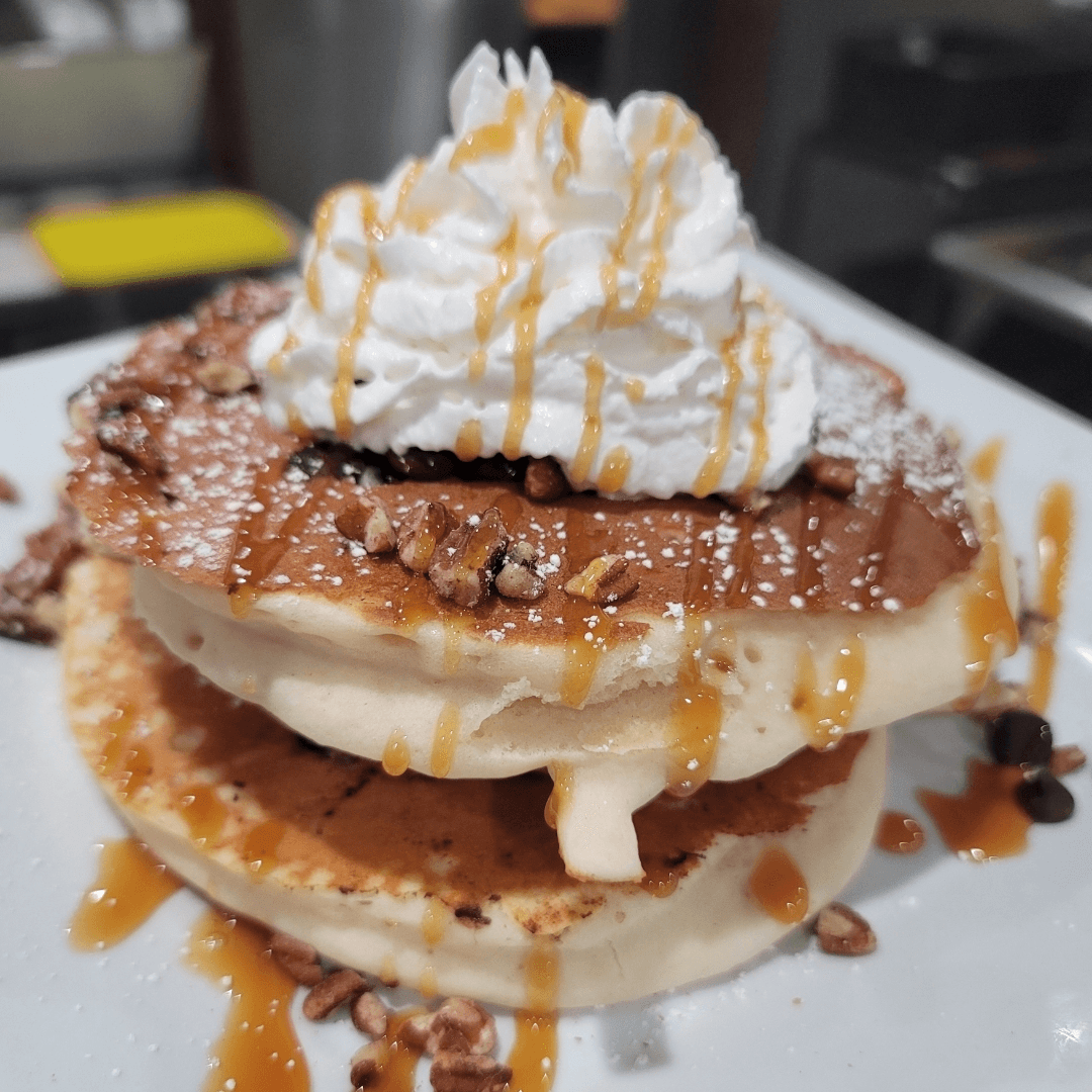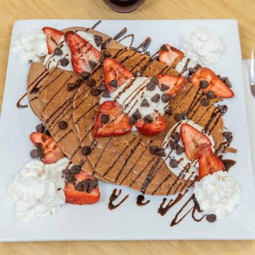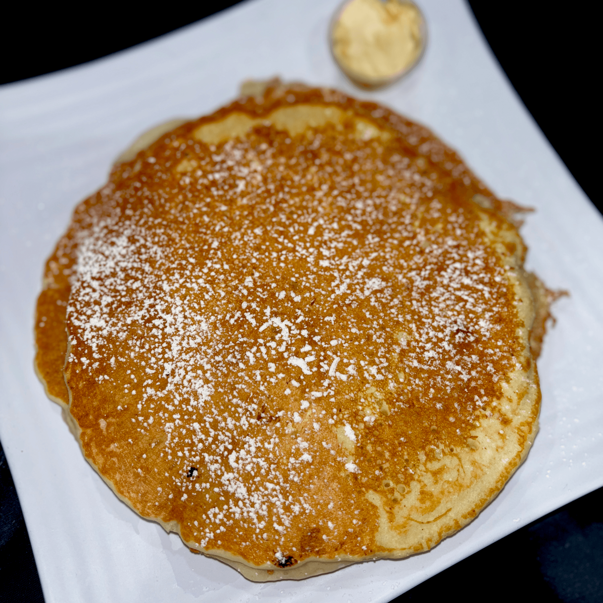 Your choice of pancakes, French toast, or waffles. The Village homemade from scratch pancakes, French toast, and waffles served with powdered sugar, butter and syrup