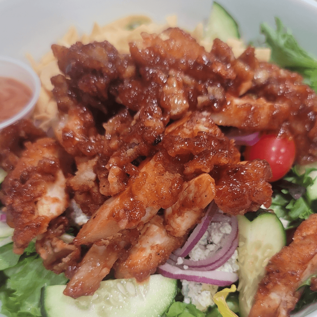 Lettuce, bleu cheese dressing tossed in a buffalo sauce. Choice of plain, whole wheat, or spinach. Served with fries. Coleslaw and pickle upon request.