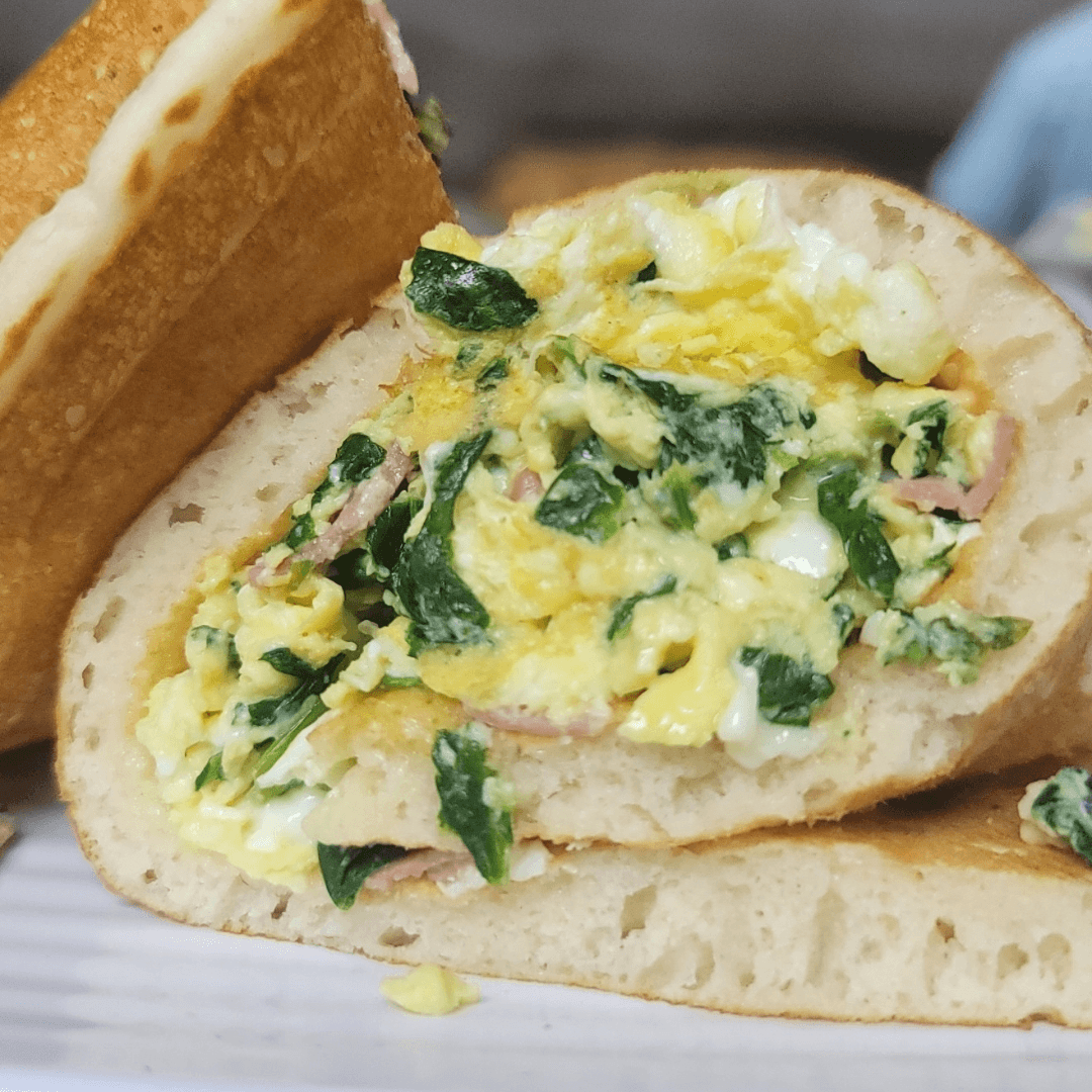 English muffin, basil pesto over sautéed spinach with hollandaise sauce. All served with two poached eggs and home fries