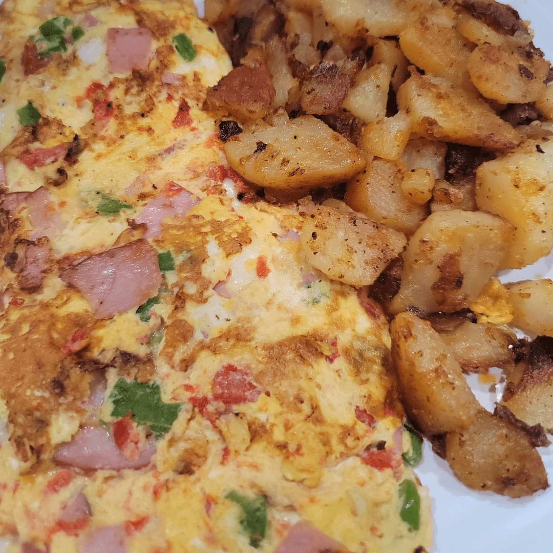 Onions, peppers, & ham. Served with home fries & toast or pancakes.