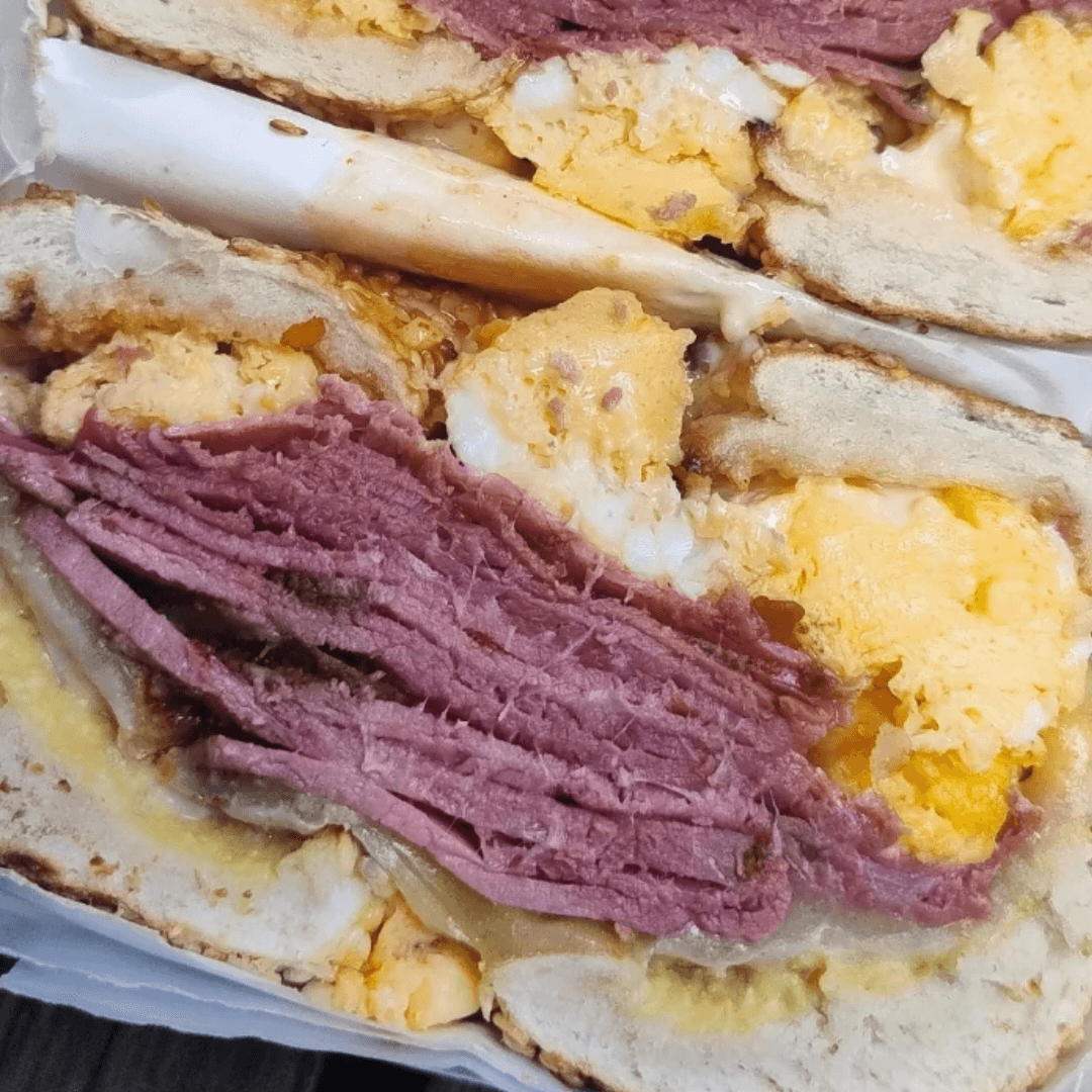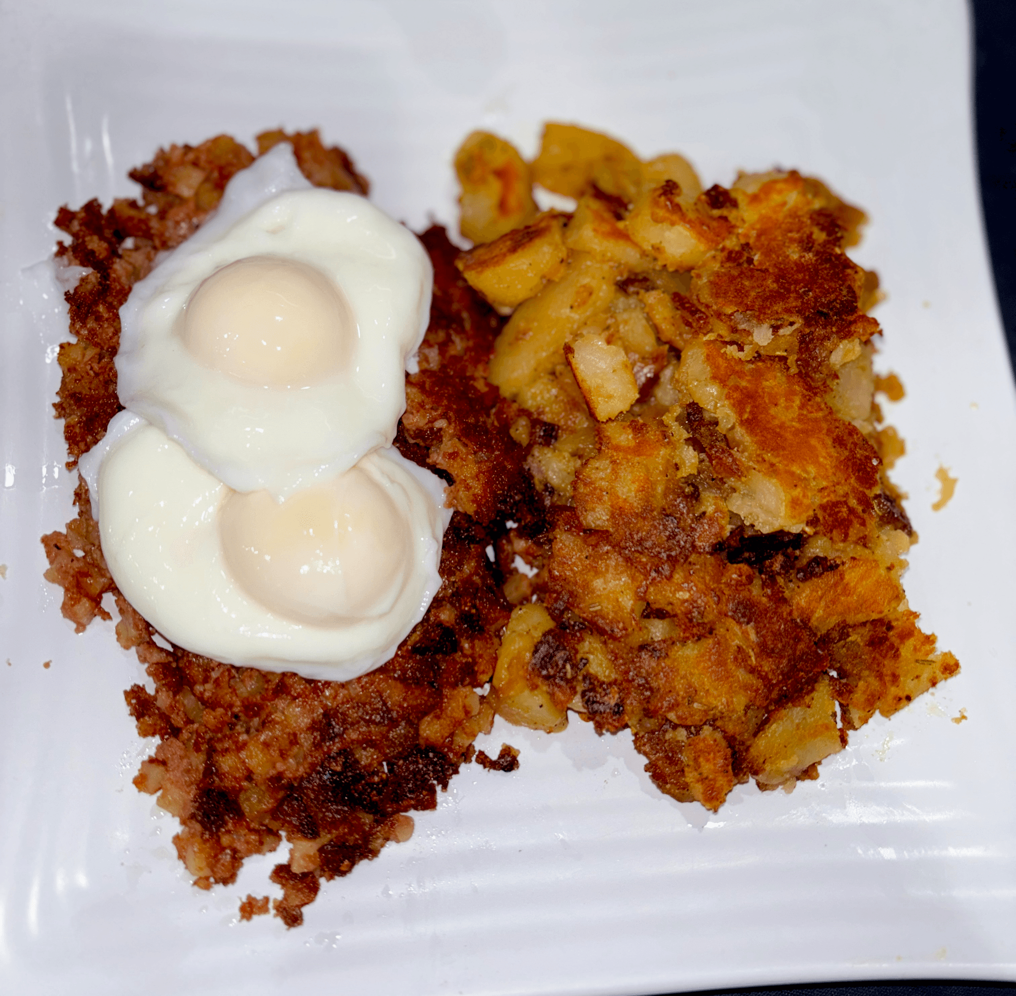 English muffin, corned beef hash, and hollandaise sauce. All served with two poached eggs and home fries