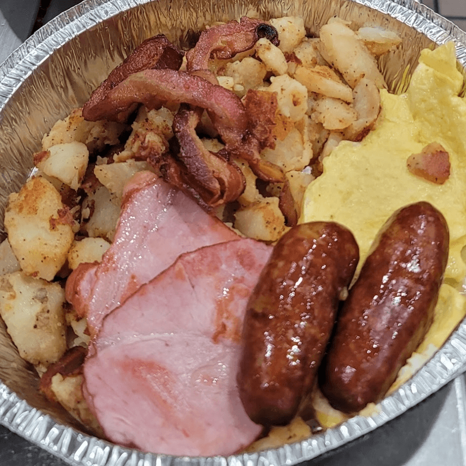 Bacon, ham, & sausage piled with choice of cheese. Served with home fries & toast or pancakes.