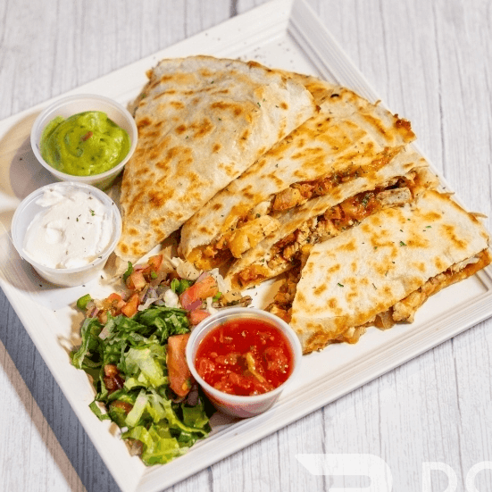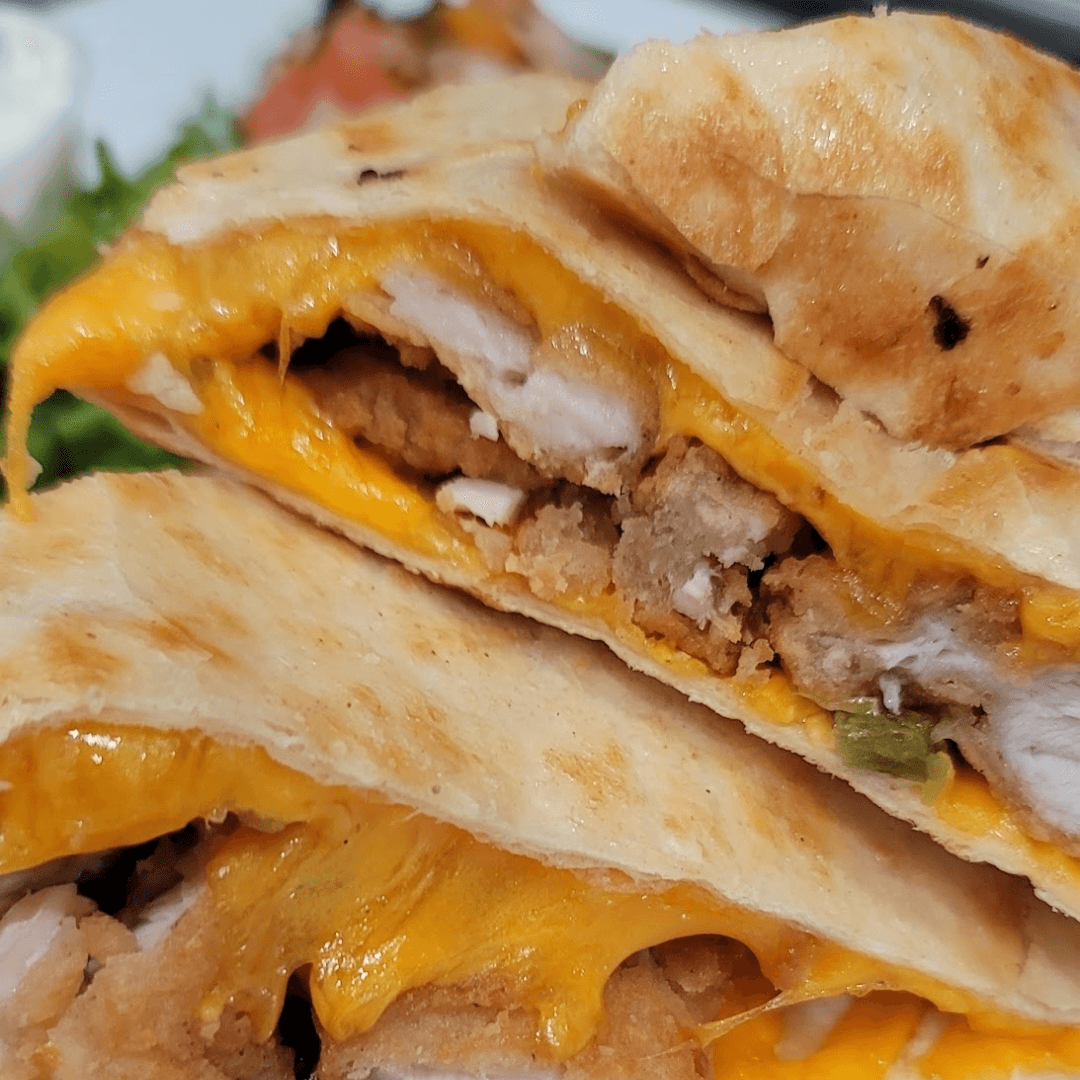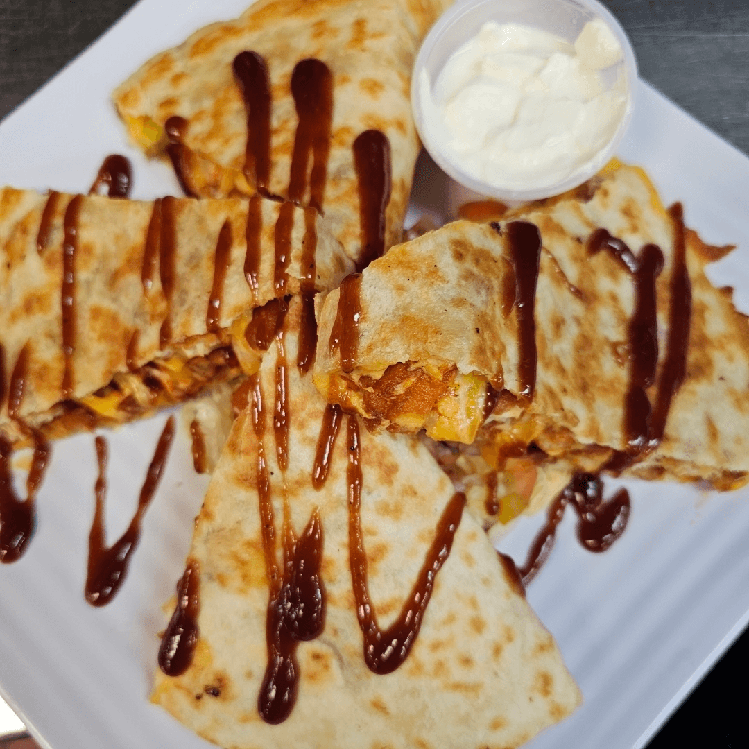 Stuffed with melted jack and cheddar, caramelized onions and BBQ grilled chicken. All served with a side of sour cream & salsa.