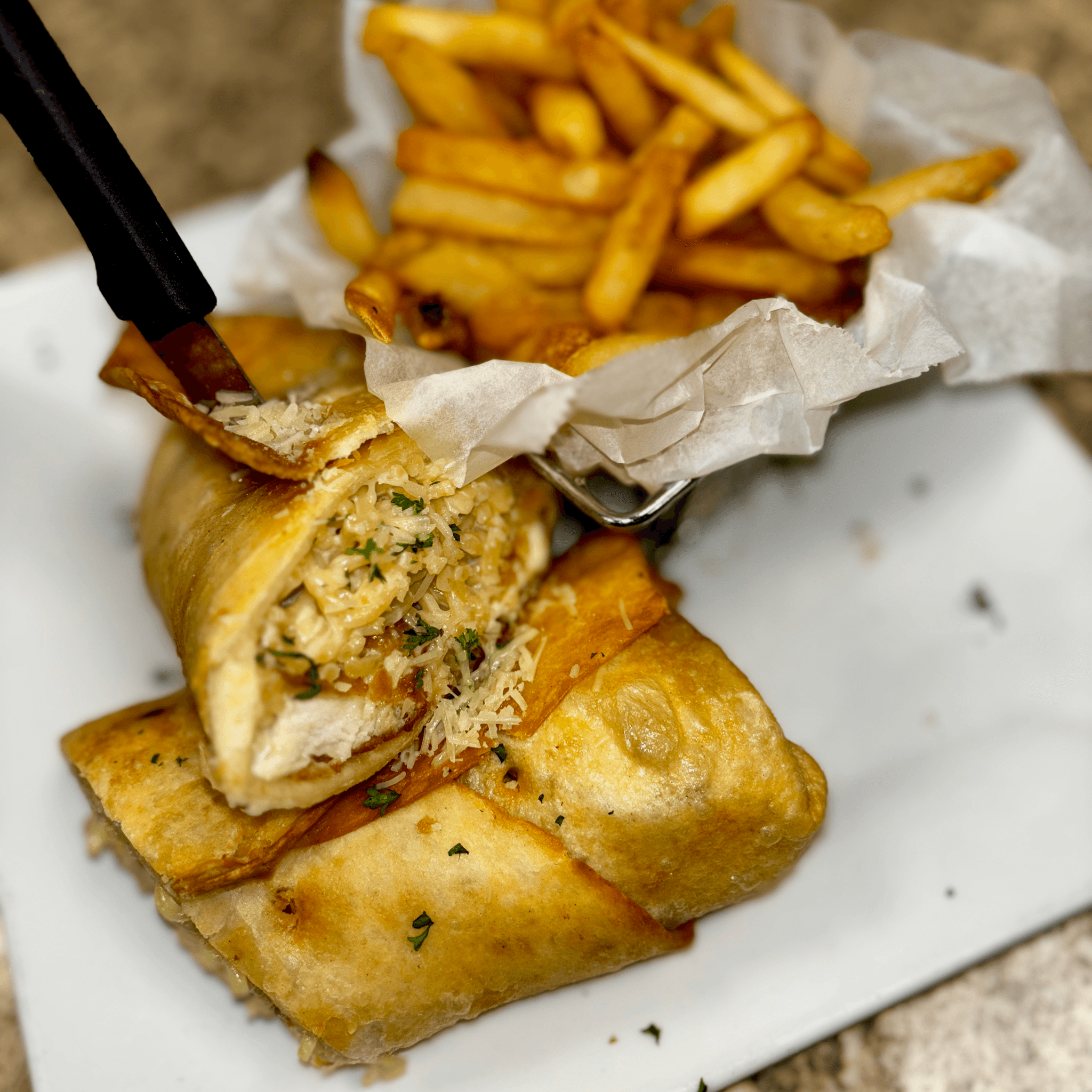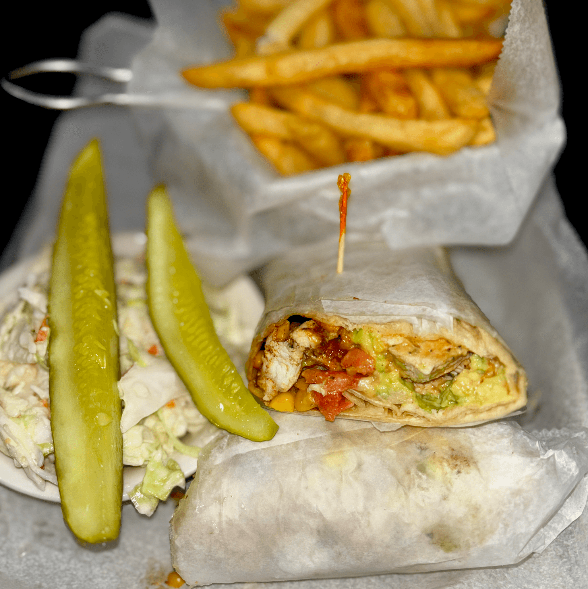 Grilled chicken with fajita seasoning. Grilled onions and peppers, rice with a side of sour cream. Choice of plain, whole wheat, or spinach. Served with fries. Coleslaw and pickle upon request.