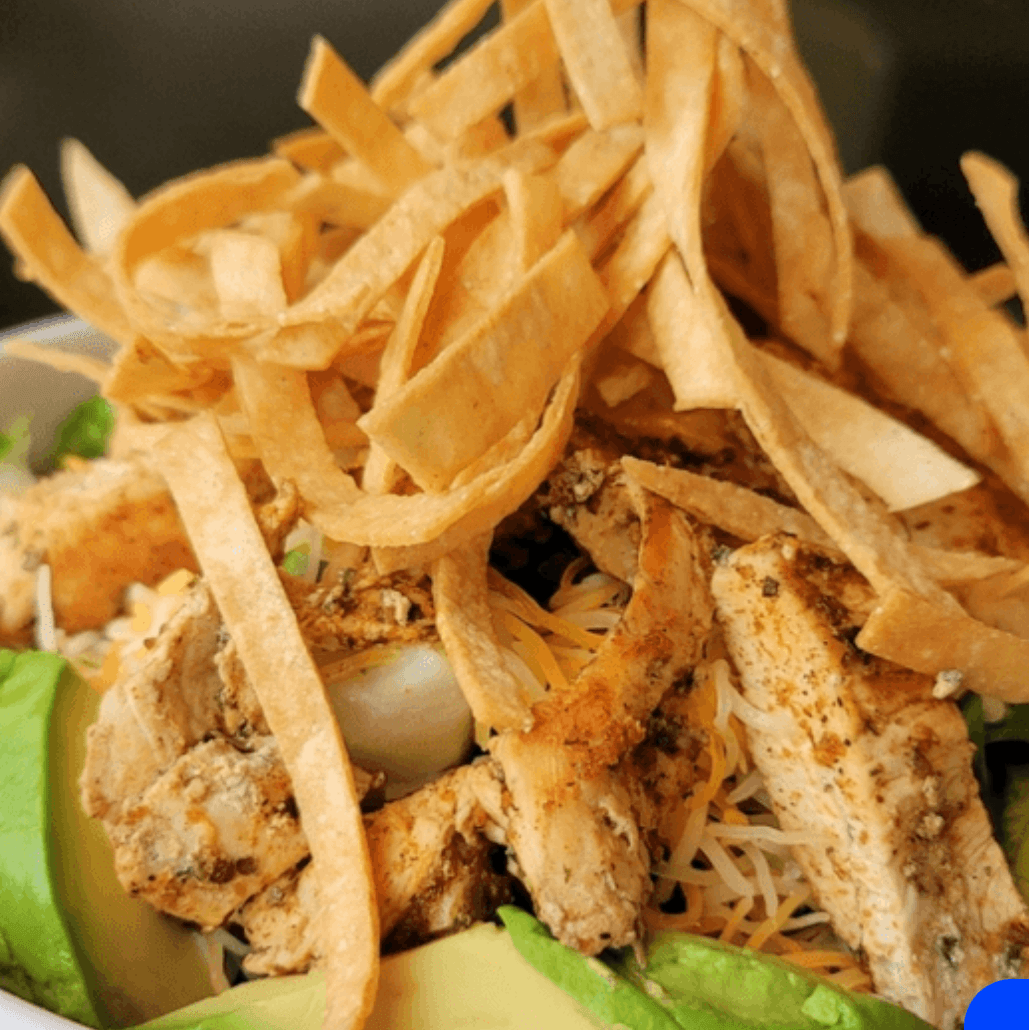 Chicken, lettuce, tomato, onions and peppers, beans, corn, and topped with melted cheddar
