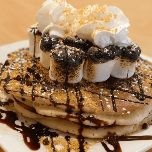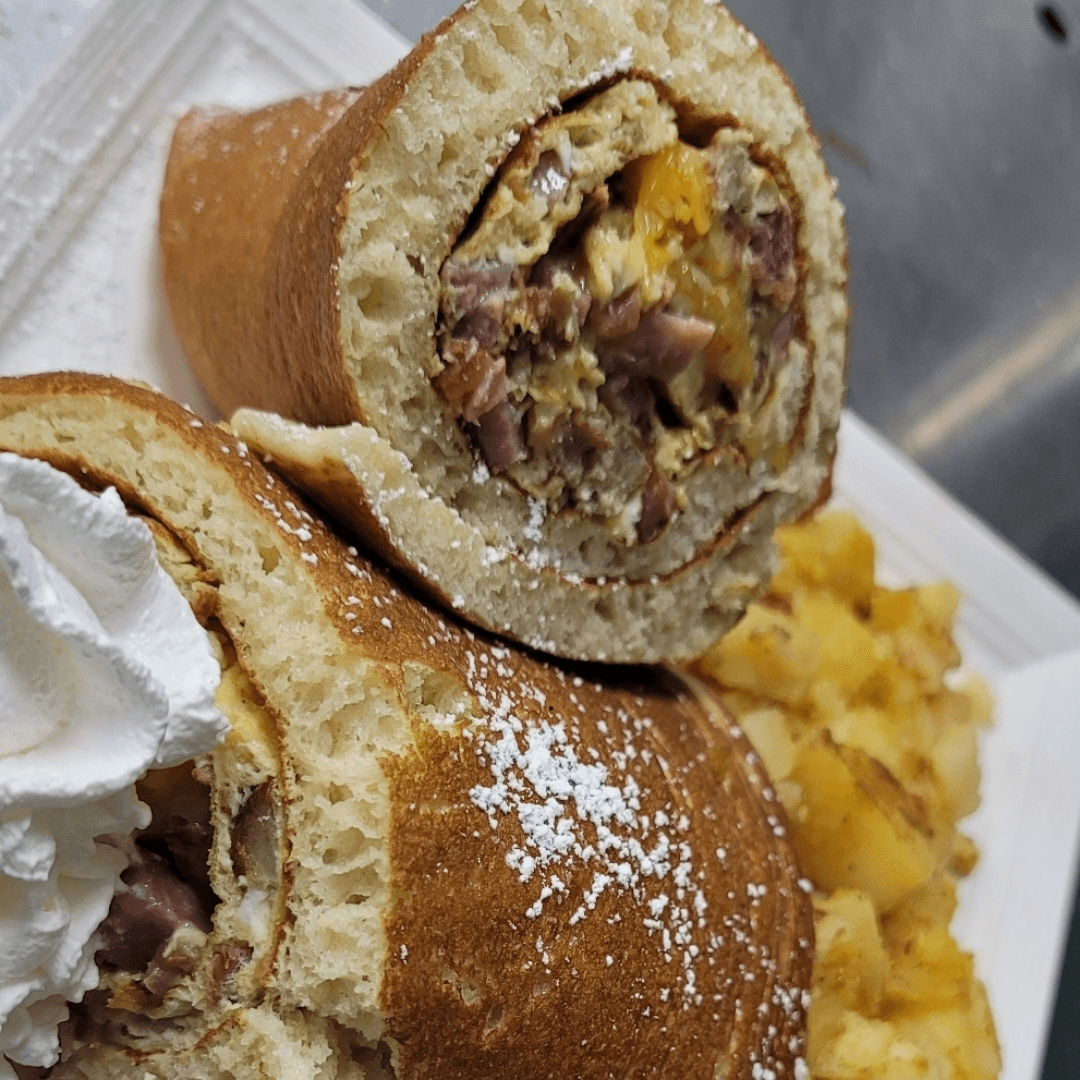 Scrambled eggs with choice of ham, bacon or sausage with cheese. All fillings are rolled up in a large pancake or stuffed in a waffle and served with homefries