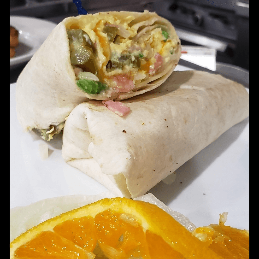 2 eggs, ham, peppers, onions, jalapeño, home fries, & cheddar cheese in a wrap
