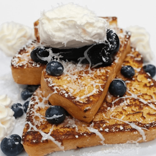 3 slices double dipped in a milk & egg batter. Served with powdered sugar, butter, & syrup