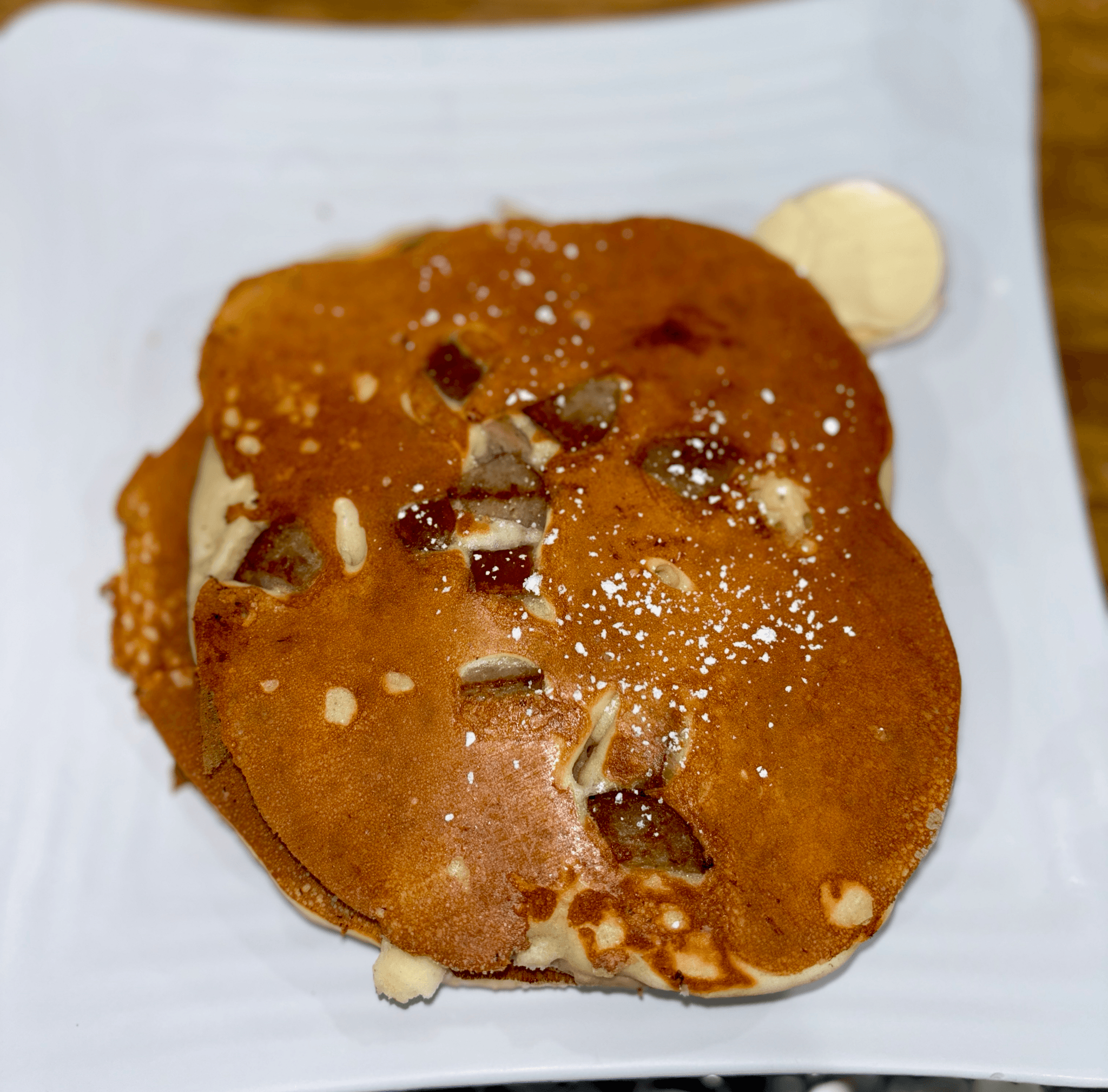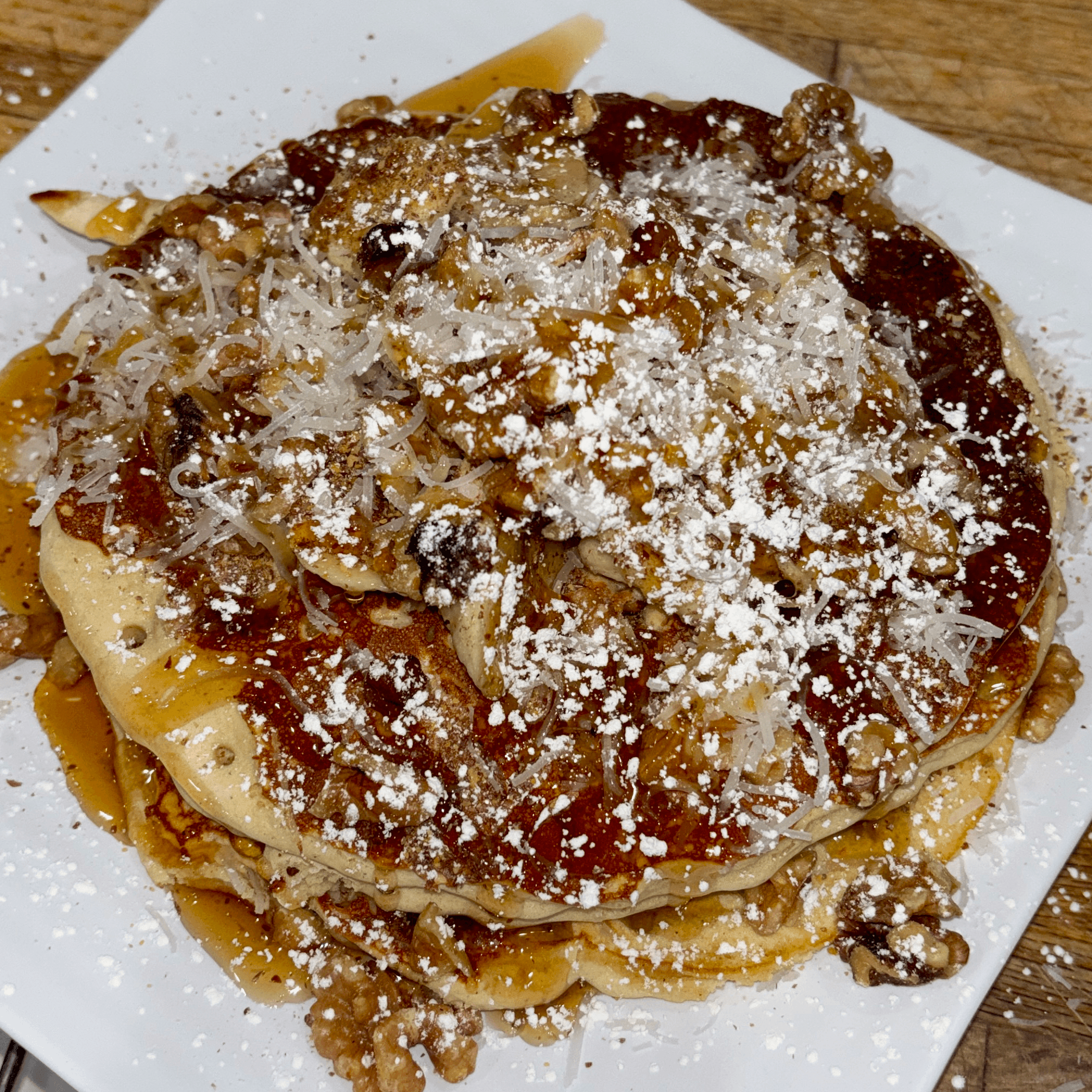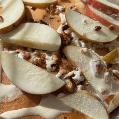 Baked with raisins and walnuts and topped with sliced apples and drizzled with vanilla sauce & cinnamon