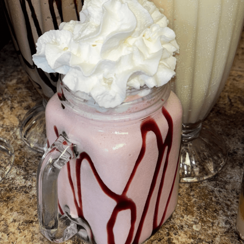 Topped with fresh bananas & strawberries. All with whipped cream.