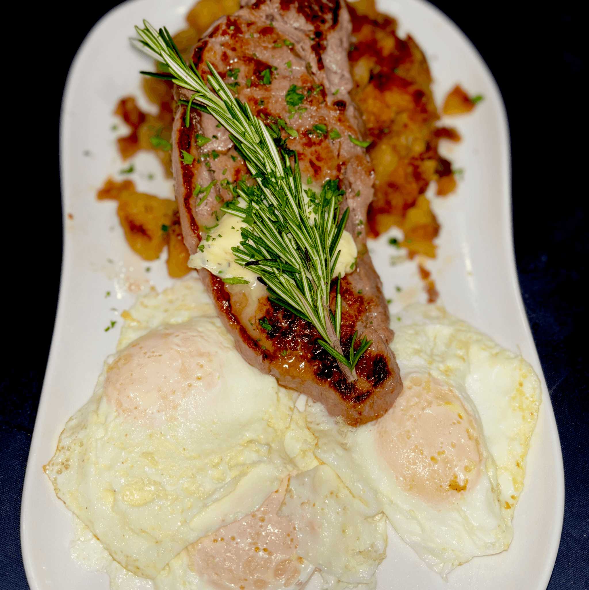 2 eggs with an 8 oz strip steak cooked your way. Our eggs are served with home fries and toast or pancakes.