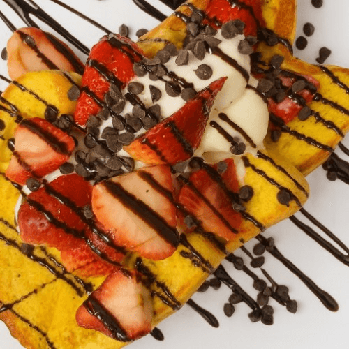 Topped with cannoli cream, chocolate chips & fresh strawberries