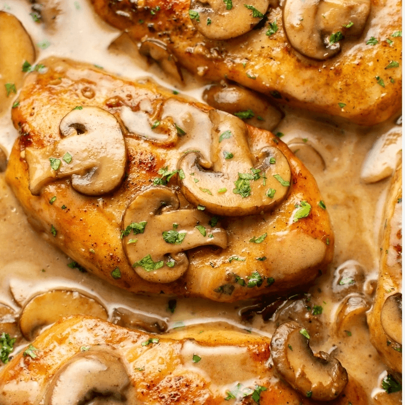 Pan seared served in a marsala wine, brown sauce and mushrooms served over pasta. Pasta plate only come with bread.