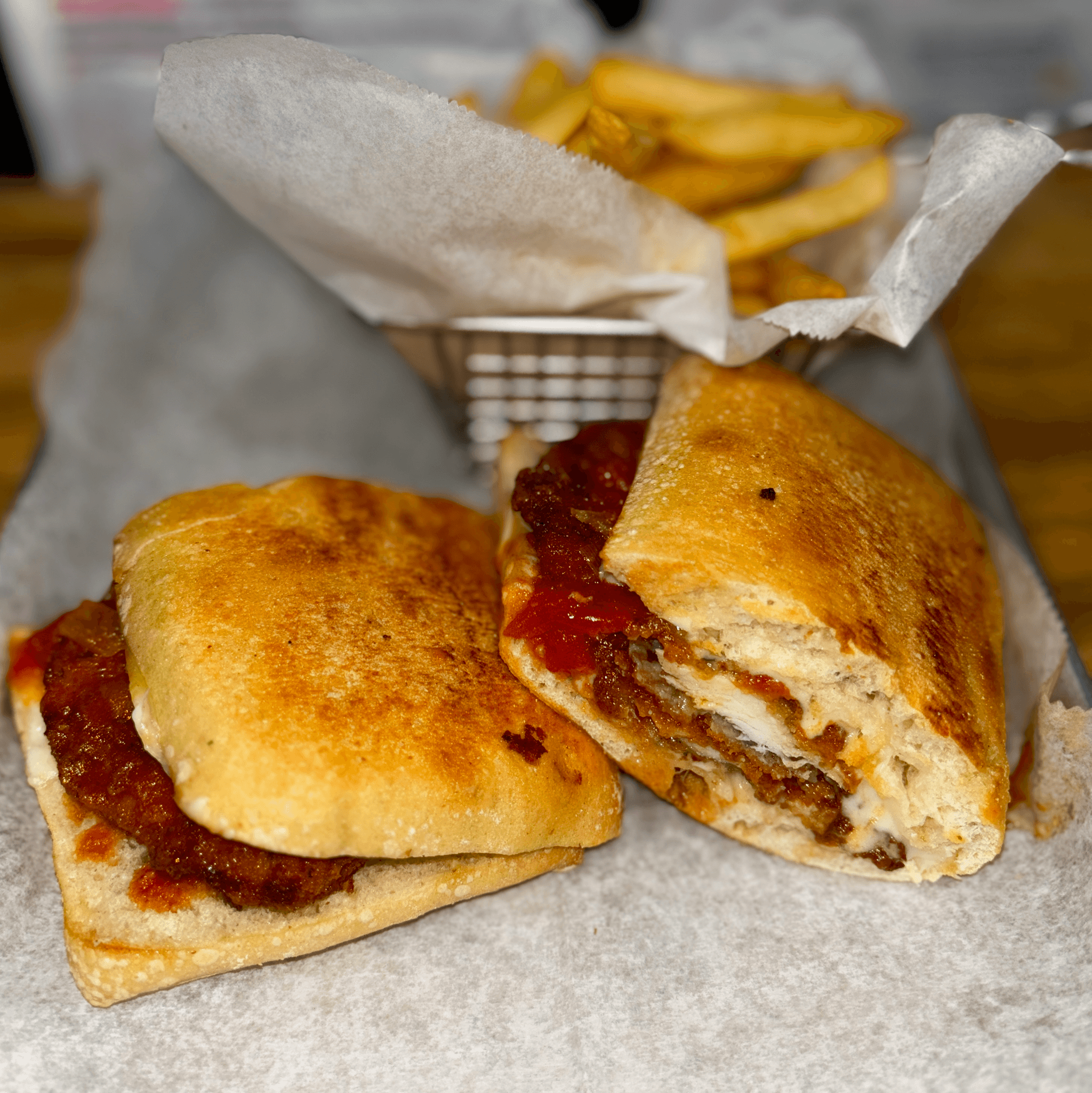 Philly Steak sauteed with onions and peppers with mozzarella cheese and tomato sauce