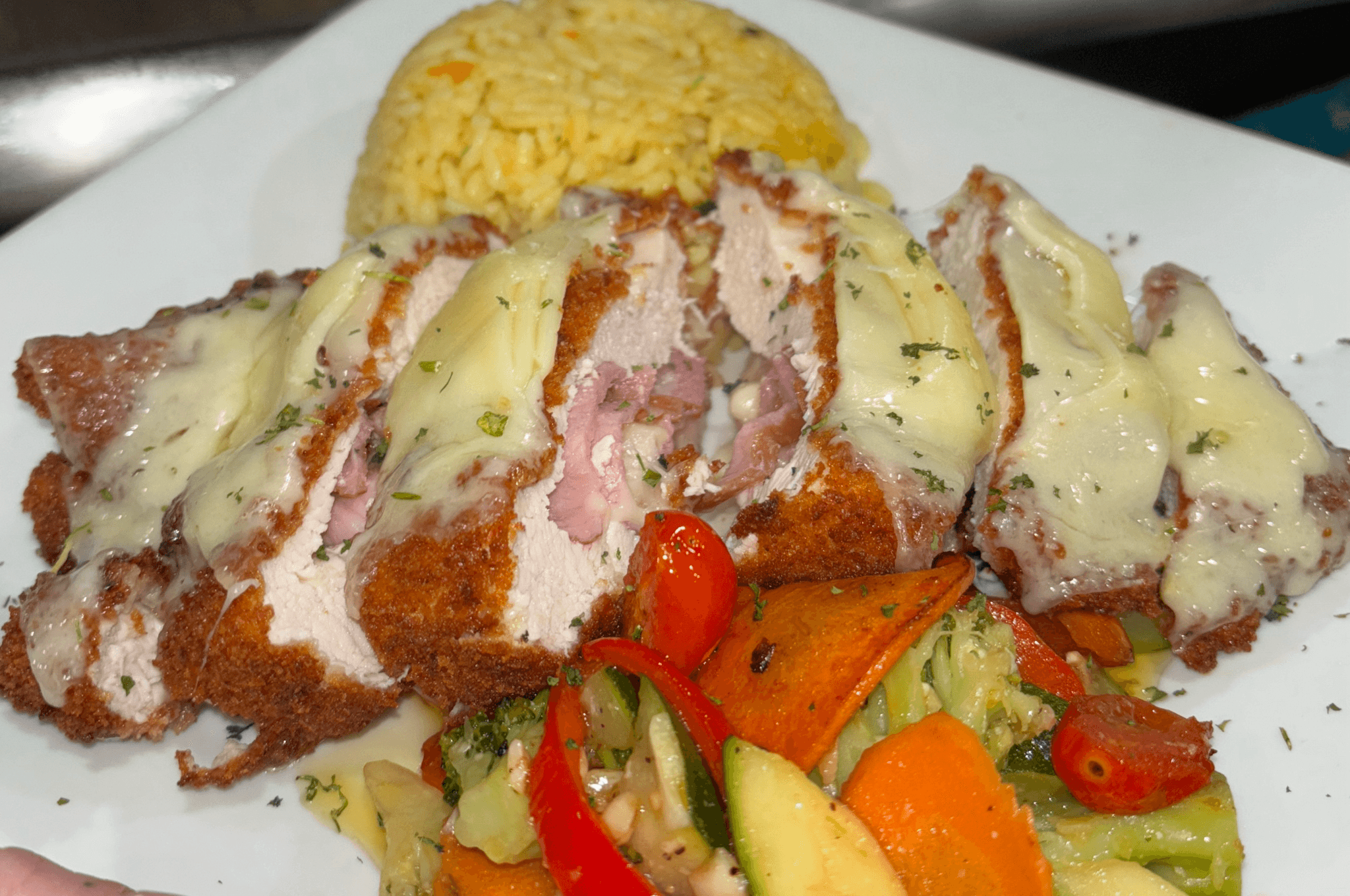Fresh chicken stuffed with Swiss and ham, pan-fried. Served with potato & vegetable.