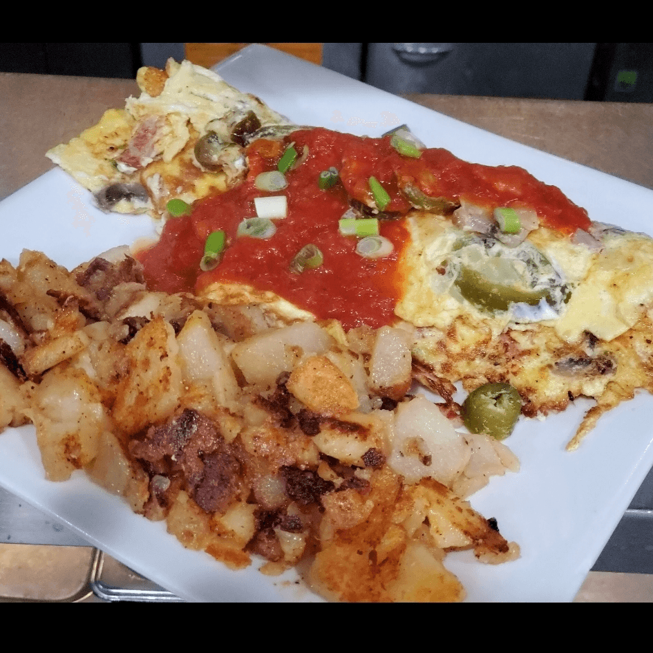 Ham, onions, peppers, mushrooms, jalapeño with red sauce over top. Served with home fries & toast or pancakes.